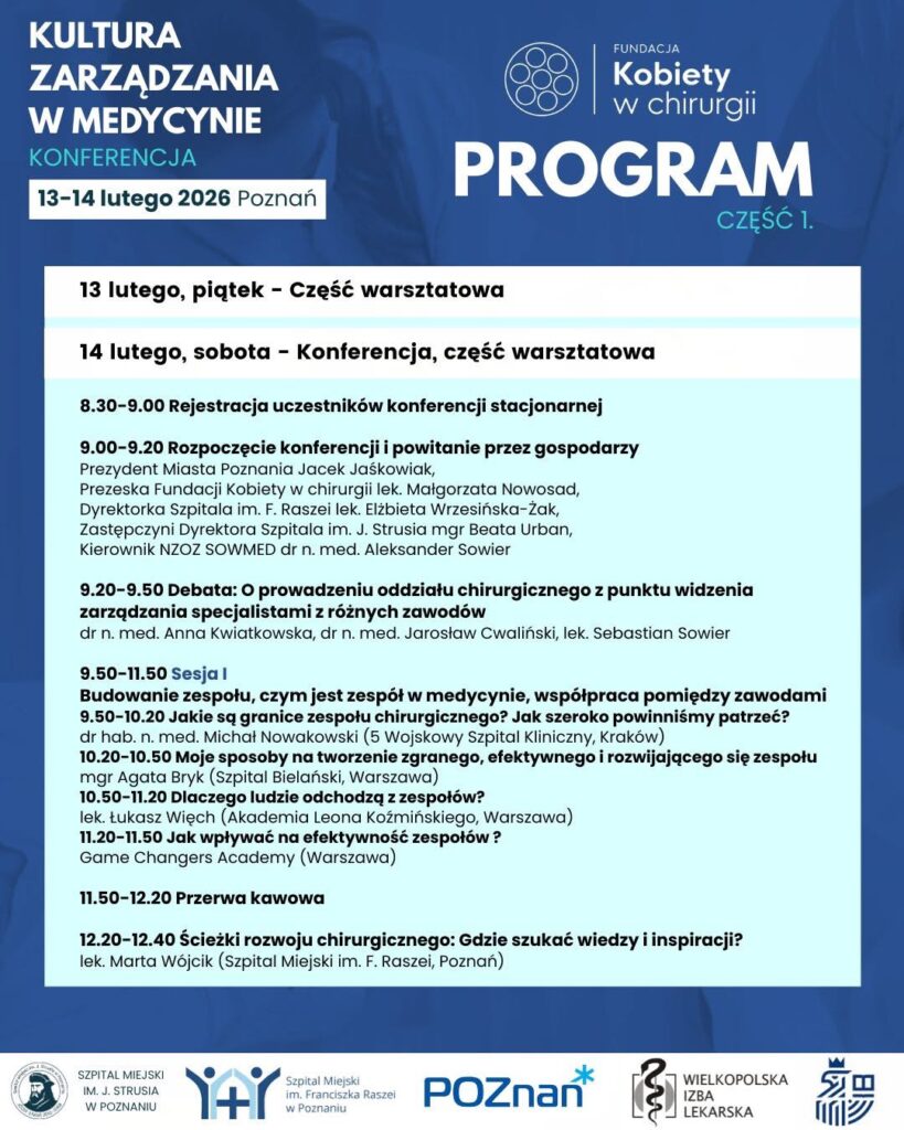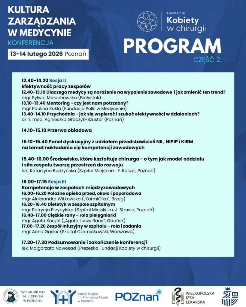 Fundacja Kobiety w chirurgii zaprasza do udziału w 2. edycji konferencji „Kultura zarządzania w medycynie”, która odbędzie się w dniach 13–14 lutego 2026 roku w Poznaniu.